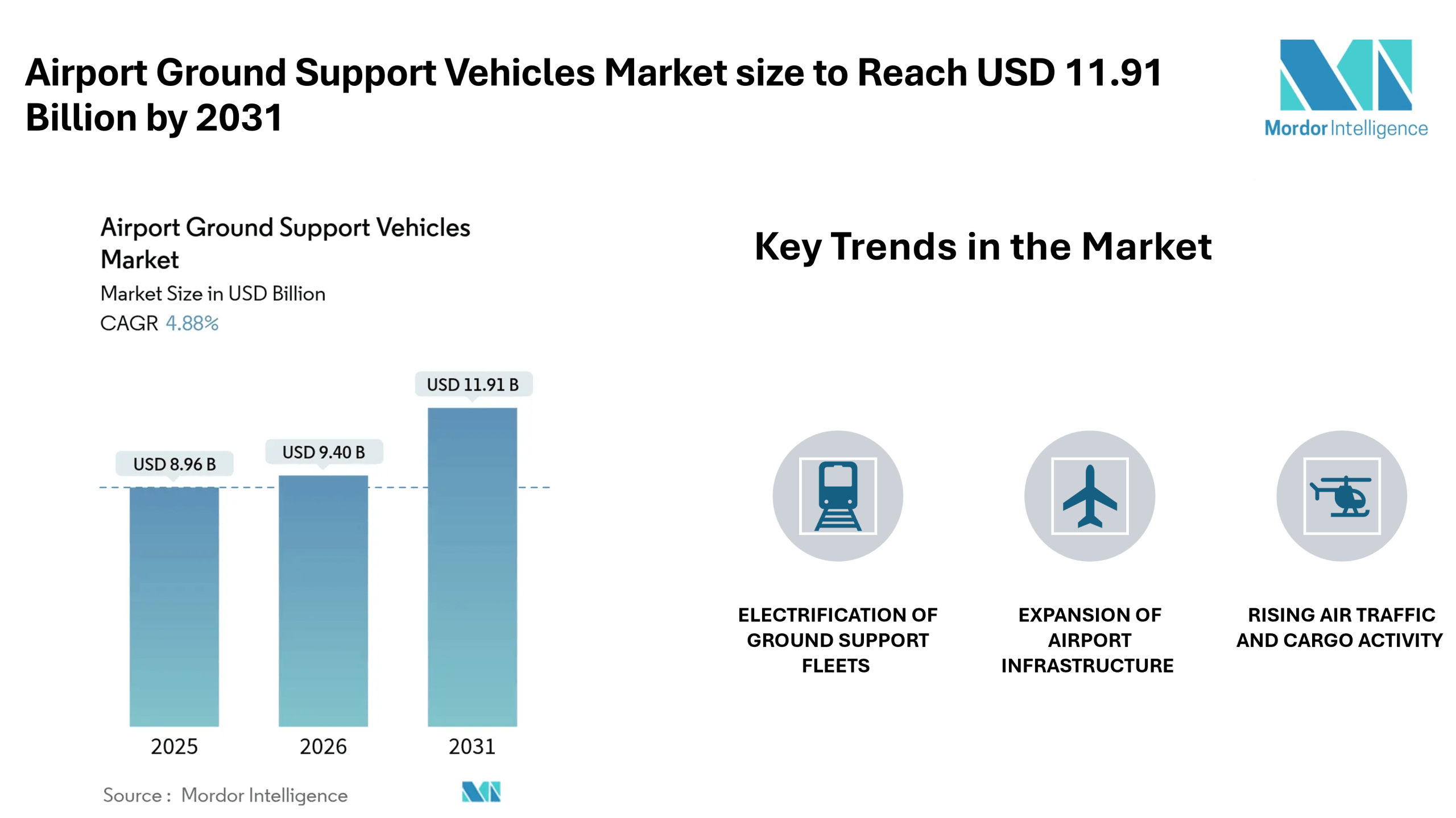 According to Mordor Intelligence, the airport ground support vehicles market size was valued at USD 9.40 billion in 2026 to reach USD 11.91 billion by 2031, reflecting steady expansion during the forecast period. The airport ground support vehicles market forecast highlights consistent demand driven by airport expansion projects, fleet modernization, and the transition toward electric-powered ground handling equipment.