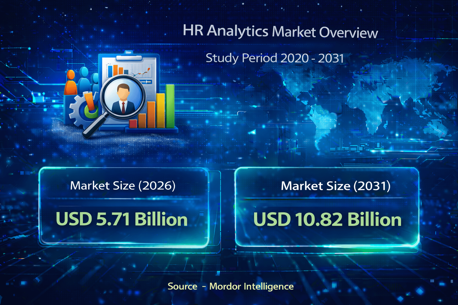 According to Mordor Intelligence, the HR analytics market size stood at USD 5.71 billion in 2026 and is projected to reach USD 10.82 billion by 2031, registering a CAGR of 13.64% during the forecast period. This steady rise in the HR analytics market reflects growing demand for data-backed workforce decisions, stronger compliance needs, and the shift toward predictive and AI-assisted HR management. The HR analytics industry has moved beyond static dashboards and basic reporting. Organizations now use analytics platforms to address attrition, pay equity, workforce planning, and skills mapping. The transition from descriptive to predictive models has become central to HR analytics market growth, especially as companies seek measurable returns from talent investments.